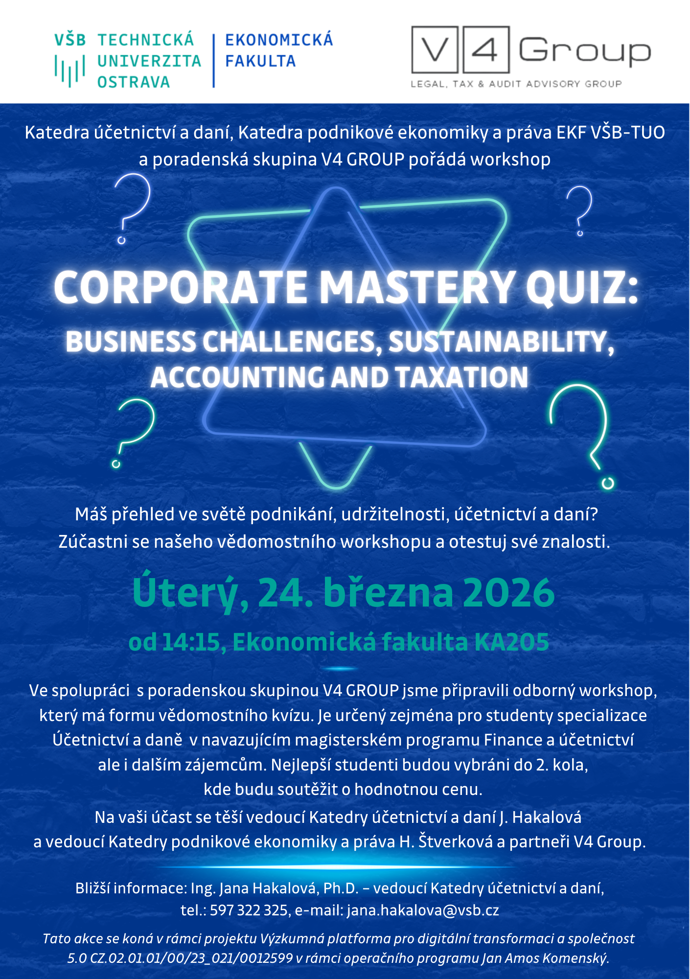 Katedra účetnictví a daní pořádá pro studenty akci dne 2. 12. 2025 ve 14.15 - 15.45 hod. na KA104 s názvem ŽIVOTNÍ PŘÍBĚH – Inspirativní setkání s odborníky z praxe, kteří Vám sdělí svou cestu k úspěšné kariéře (ale i to co museli v osobním či profesním životě překonat) v oblasti účetnictví, daní, auditu. Všichni se těší, že s Vámi budou diskutovat a poskytnou Vám cenné rady, kam zaměřit postupně své kroky, aby se z Vás stali např. partneři ve velké čtyřce, auditoři, finanční ředitelé, specialisté apod. Pozvání přijali: